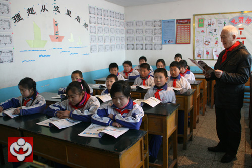 中国关工委在黑龙江捐建的千秋希望小学里“五老”在给孩子门讲解建校史