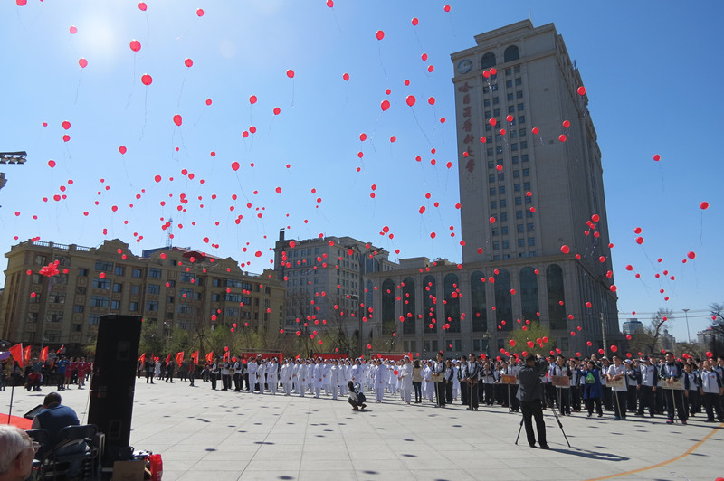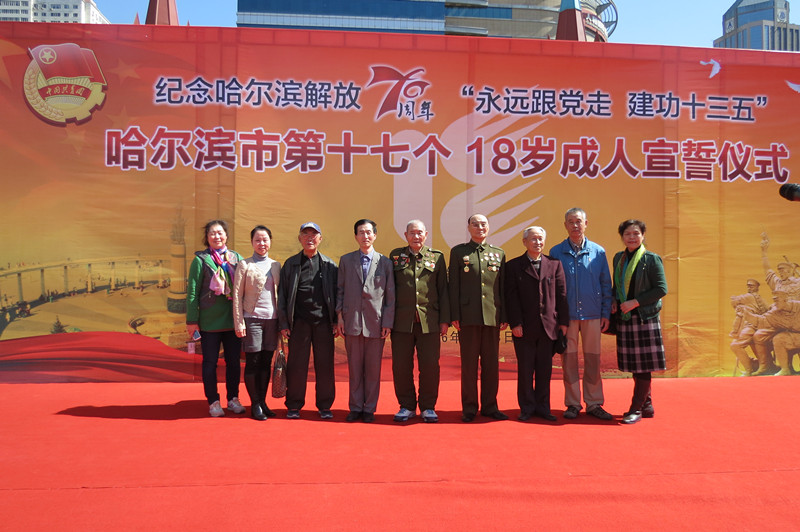 4月28日是哈尔滨解放70周年纪念日,也是哈尔滨市第十七个18岁成人宣誓日。当天下午,伴随着庄严激昂的共青团之歌,南岗区关工委组织自创《光辉的历程 永恒的丰碑》党史图片展览的王士屏、雷锋生前战友梁友德、抗美援朝老战士郭发宝、解放战争老战士孙玉文、创办《雷锋事迹展馆》的叶滨昌、创办《家乡巨变》历史展览的朱俊峰等六名优秀“五老”参加在青年广场隆重举行纪念哈尔滨解放70周年暨“永远跟党走 建功十三五”哈尔滨市第十七个18岁成人宣誓仪式。700余名18岁青年代表参加了集中宣誓仪式,全市约2万余名青年学生以各种形式参加了18岁成人宣誓主题教育活动。