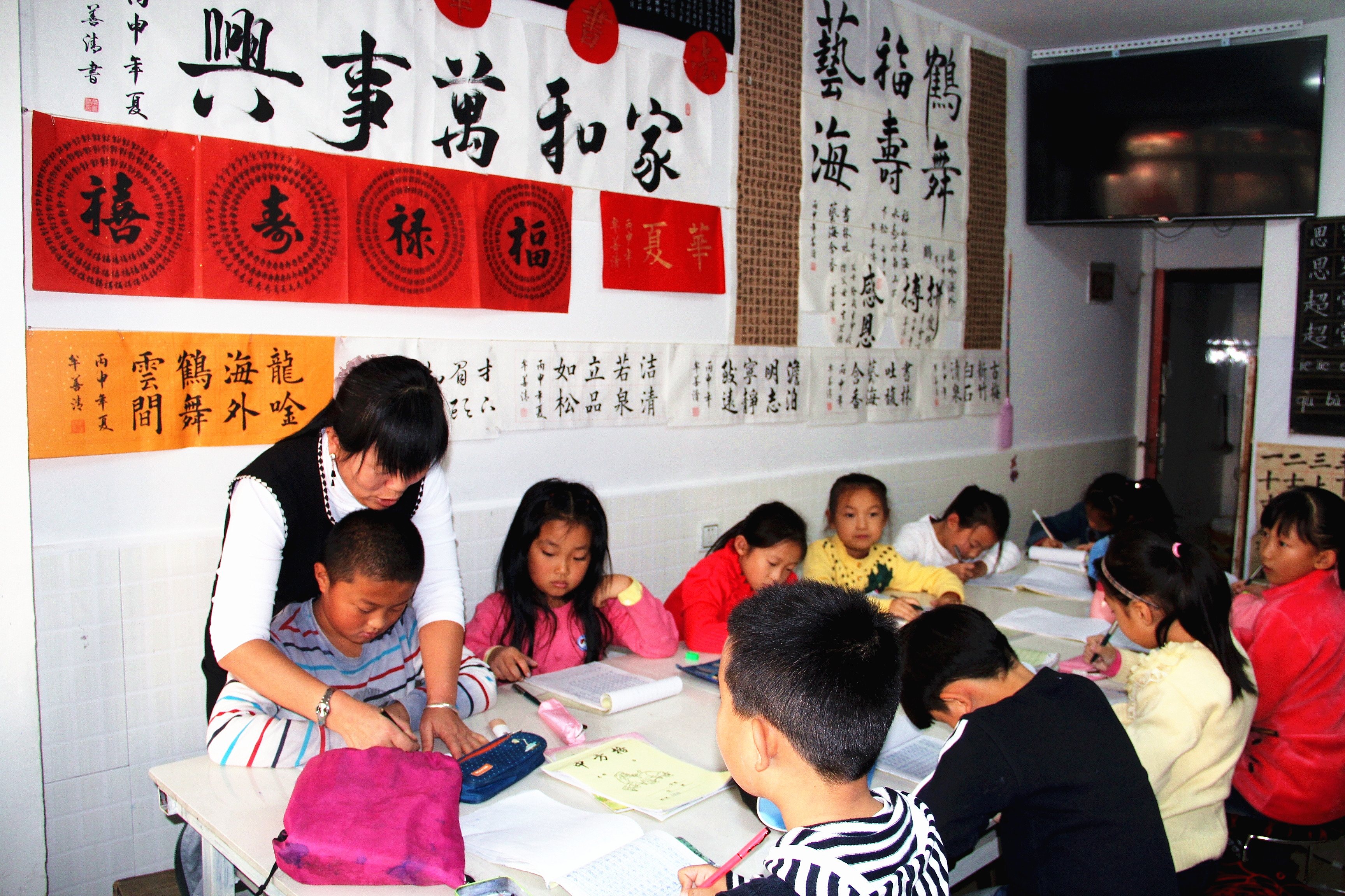图为牟老师指导小学生写书法的场面