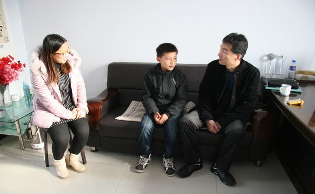 县公安局副局长高世杰(右1)深入学校同王宝傲的老师了解王宝傲(居中)的学习情况