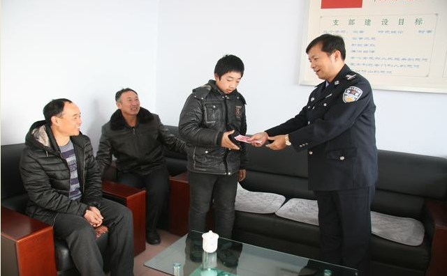 县公安局副局长张立新(右1)把500元助学金交到翟胜手(右2)中