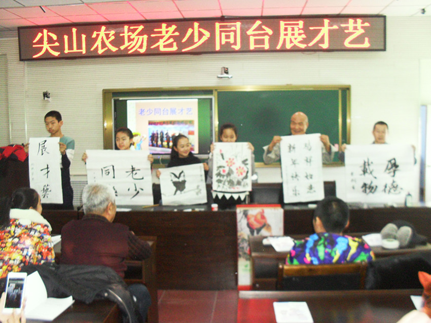 1月14日上午,由农场关工委和教育科联合举行的老少同台竞技的书法、绘画比赛在学校电教室举行。来自社区的“五老”和孩子同台献艺,各显身手,让大家领略两代人的风采。