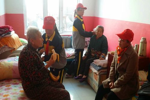 少先队员身着整齐服装,头戴爱心小红帽,为老人们送去慰问品,体现了少先队员们尊老、敬老的深情厚意。敬老院里一片欢声笑语,孩子们认真细致地为老人整理房间,打扫卫生,和老人们亲切交谈,希望老人们保重身体,安度幸福晚年。老人们喜悦开心挂在脸上,和孩子们共度欢乐时光,亲切地讲述起过去的生活经历和今天的幸福生活,孩子们饶有兴趣的品味她们经历的童年往事,切身感受到党和政府给人民群众创造的美好生活。