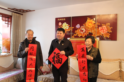 首先,孙立国书记代表市委,给毕老送上了一封慰问信和一幅对联。大大的“福”字,用中华民族优秀文化传统,表达了市委对老干部的关爱之情;“同砥砺共兴伟业,再前行不忘初心”的文意,激励无私献爱心的关工委“五老”夕霞辉映。