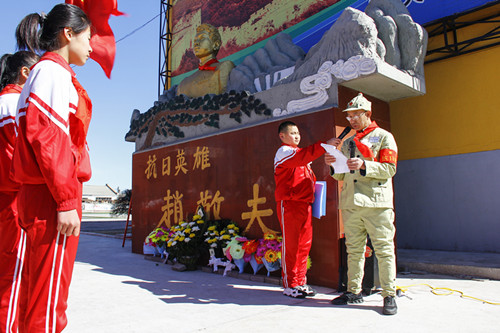 赵敬夫烈士的后裔、敬夫小学校外辅导员白保民身穿抗联服装,为师生们讲述了赵敬夫烈士生平和事迹:赵敬夫,原名:白长岭,1916年出生,1930年考入桦川中学,1935年,在党组织的培养下,经张耕野介绍,光荣地加入了中国共产党,不久担任了支部宣传委员,从此开始了他的革命生涯。
