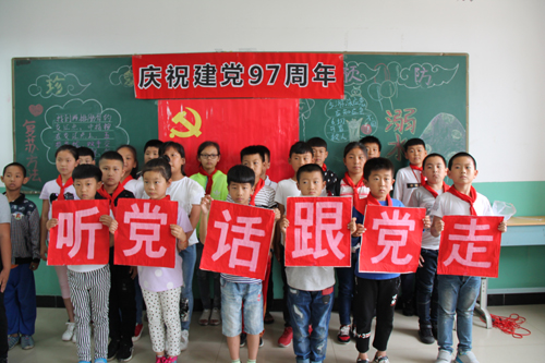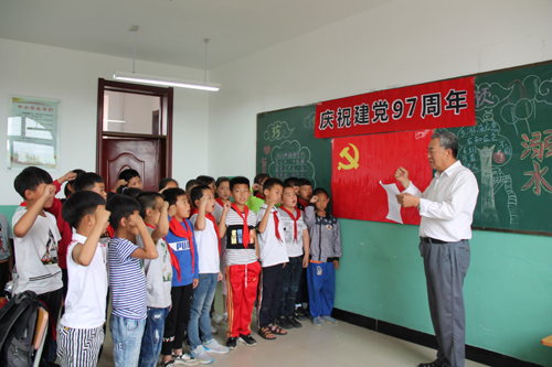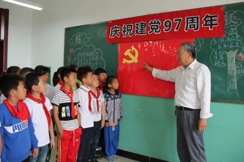 6月25日,鲜艳的党旗挂在小学三年一班教室墙上,场关工委张永贵,手指党旗向同学们讲解党旗的意义:中国共产党党旗旗面为红色,上有由黄色的锤子、镰刀交叉组成的图案。红色象征革命,黄色的锤子、镰刀代表工人和农民的劳动工具,象征着中国共产党是中国工人阶级的先锋队,代表着工人阶级和广大人民群众的根本利益。