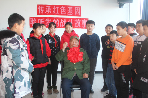 3月27日,哈拉海农场关工委、子弟校举办“传承红色基因.聆听我的抗战故事”故事会。关工委聘请89岁的抗美援朝老兵赵功臣进校园,为四年一班学生讲述他的战斗故事。老人参加过朝鲜战场上的5大战役,与毛岸英同批入朝作战,并参加过毛岸英烈士追悼会。老人头脑清醒,向同学们讲解在硝烟滚滚激烈的战场上,尸体遍地都是,当讲到他的4个好战友都牺牲了的时候,老人哽咽落泪,他说:“他们都不满20岁,没有看到祖国的今天”。勉励同学们要向英烈学习,传承红色基因,珍惜今天的幸福生活,做新时代的好少年。