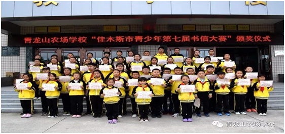 5月29日,为庆祝中华人民人和国成立70周年、少年先锋队建队70周年,激励和引导广大青少年大力弘扬爱国主义精神,营造良好学风,培养学生多读书、读好书和强写作的能力,青龙山农场关工委联合学校在教学楼前举行佳木斯市青少年第七届书信大赛颁奖仪式。
