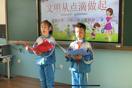 育英小学关工领导小组主要领导表示:将一如既往地开展文明礼仪“5+4”活动,对此项工作长抓不懈,努力形成学校、家庭、社会“三位一体”的教育网络,为学生的终生发展打下良好基础。