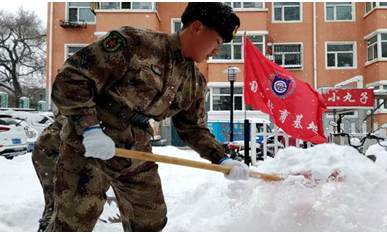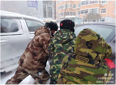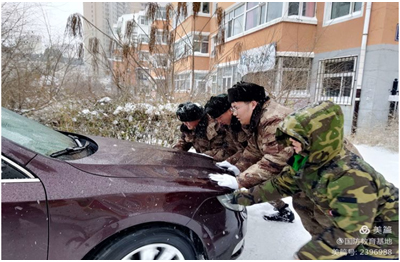 下了一夜的暴风雪把所有的道路铺的厚厚的。行人都不方便走路,更别说车辆,那是寸步难行啊。齐齐哈尔市关工委青少年教育基地的老兵一马当先,冲锋在先。队长胡连吉第一时间联系共建单位信息工程学校,组织即将参军成为新战士的同学们成立志愿小分队,统一组织,统一服装,统一行动,来到辖区居民小区,义务的为居民清雪,为居民出行开路。帮助警力有限的新华派出所铲除积雪,保障警力第一时间能够出动。同时也通过这次志愿活动为学生灌输积极的思想和奉献的精神,为将来在部队成为一名优秀的人民战士打下良好基础。来回行走的路上看见私家车趴在雪地上行动不了,他们就主动上前,一台一台地帮助推车,过膝的大雪,凛冽的寒风,阻挡不了老兵志愿者的脚步,更压倒不了战士们的士气。他们个个像一只下山猛虎,不怕苦,不叫累,传承志愿精神,发扬优良传统!