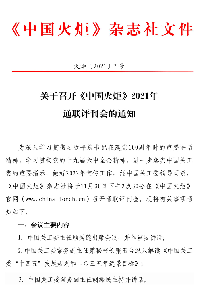 关于召开《中国火炬》2021年 通联评刊会的通知