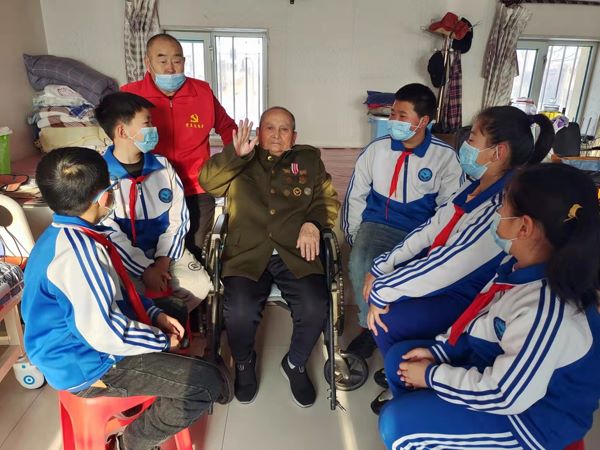少先队员向赵、李二老敬献红领巾和福字对联,他们围坐在李老身边,听李老讲述回忆当年的峥嵘岁月。李老还拿出二等功荣誉证给我们看,讲述他的艰辛且光荣的战斗历程,以誓死保家卫国的决心冲锋在前,用鲜血和生命将敌人击退。当讲述到很多个年轻战友都在他身边倒下时,李老语气略带哽咽,少先队员也听的热泪盈眶。李老感人的讲述让少先队员们感受到和平环境的来之不易,少年一代更应该奋发图强,向革命先辈致敬、学习。