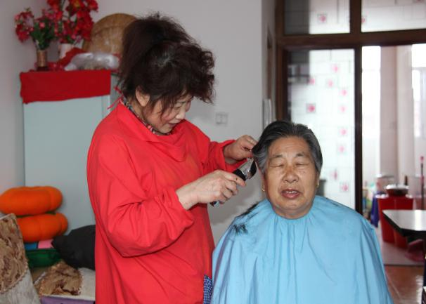 图为八五六农场有限公司场直社区关工委“五老”李翠英为居家行动不便的老人到家义务理发一幕 (张军 由世红 王景福)