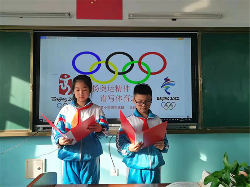在雄壮的国歌声中,开学第一课活动正式拉开帷幕,随着冬奥会主题曲“一起向未来”的音乐响起,同学们激情满满的一起合唱,各班活动进行的如火如荼。育英小学主要领导和关工领导小组希望全体师生能够以本次冬奥会为契机,不断加强锻炼,增强体魄,掀起全校师生健身的新高潮,开创本校体育工作的新局面。