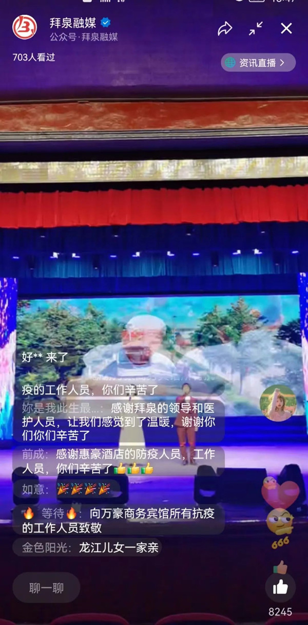 台上精彩表演,线上喝彩不断。弹幕中,集中隔离人员们对防疫工作者的精心照顾和演员们的辛苦付出表示了感谢。他们纷纷留言:“太谢谢你们了,为了缓解我们的压力和寂寞,昨天给我们创作了鼓舞士气的小快板,今天又为我们线上直播了文艺演出”“感谢拜泉县的领导和医护人员,让我们感觉到了温暖,谢谢你们,你们辛苦了”……