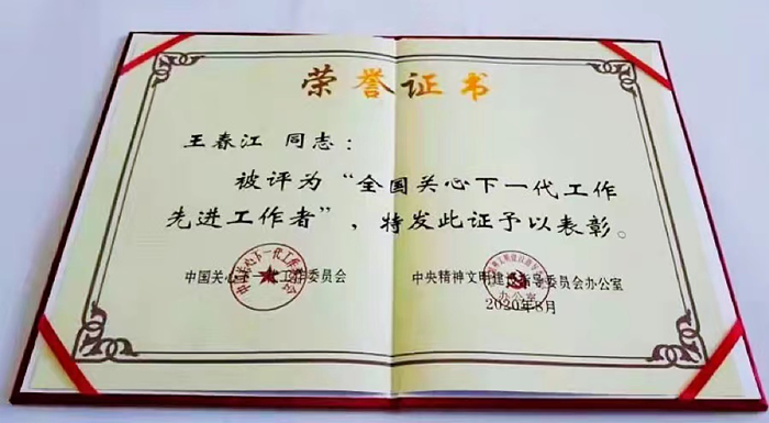 2008年,被黑龙江省委办公厅、黑龙江省政府办公厅评为关心下一代工作先进个人;2010年,王春江被评为全国关心下一代工作先进工作者;2011年,被哈尔滨市委办公厅、哈尔滨市政府办公厅评为关心下一代工作先进个人;2012年,被延寿县委、县政府评为关心下一代工作先进个人标兵;2013年,被中共中央宣传部、文化部、国家新闻出版广电总局评为全国服务农民、服务基层文化建设先进集体;2018年,被黑龙江省关工委评为全省关心下一代工作先进个人;2019年,被哈尔滨市关工委评为优秀五老标兵;2019年,“春江文化大院”被黑龙江省关工委评为优秀儿童之家;2020年,被全国关工委评为关心下一代工作先进个人;2021年“春江文化大院”被省关工委确定为“省级关心下一代最佳工作品牌”。