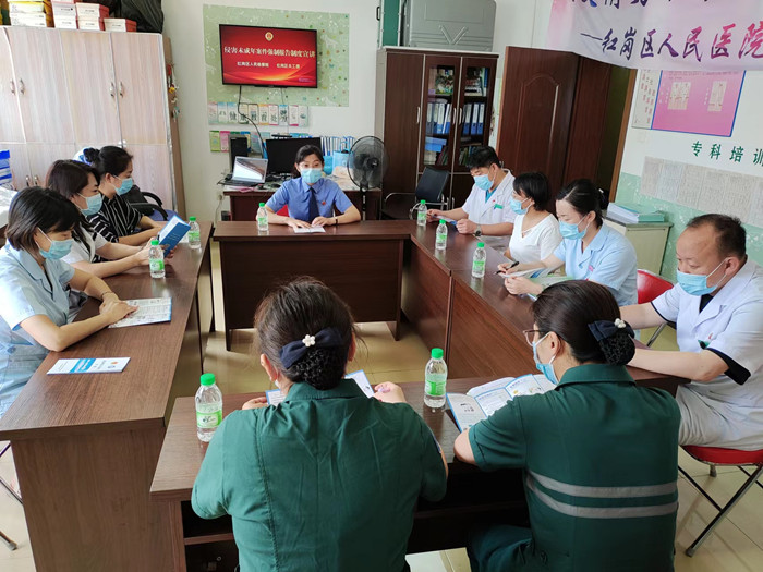 为进一步推动侵害未成年人强制报告制度落地落实,及时有效的发现惩治侵害未成年人犯罪。7月15日,大庆市红岗区关工委携同区人民检察院“童心圆·红检童声”未检团队走进红岗区人民医院开展强制报告制度宣传活动,检察官为医护人员宣讲并解读了《关于建立侵害未成年人案件强制报告制度的意见(试行)》相关规定。