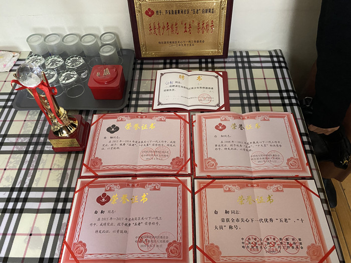 为表达对“五老”的尊重和关心,鼓励他们继续投身关爱下一代工作,10月17日,省关工委常务主任郭晓华走访慰问“五老”白韧,为他送去2000元慰问金及果篮,亲手颁发“最美五老”荣誉证书。哈尔滨市关工委常务主任张桂华,南岗区关工委主任倪小平陪同参加。