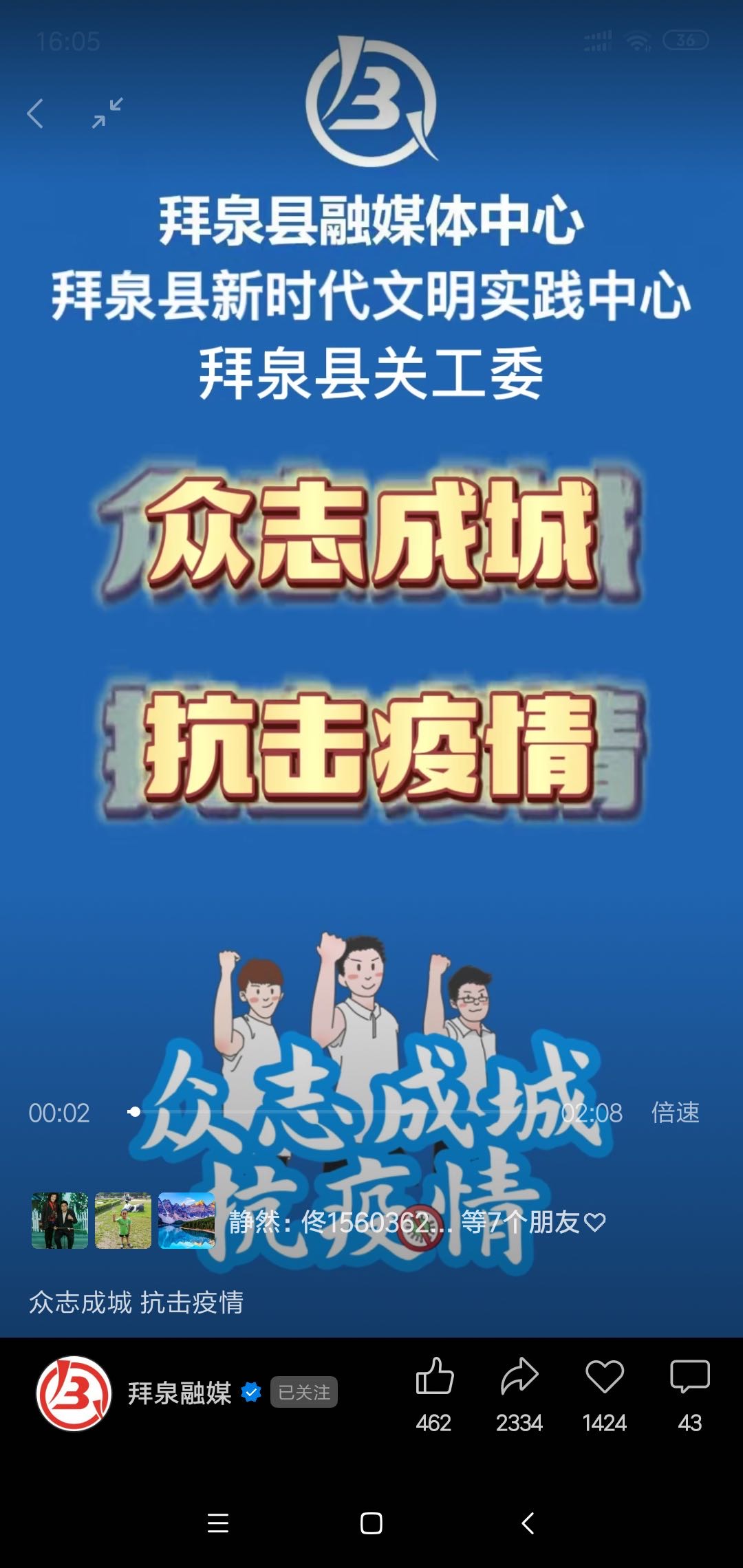 为配合全县做好疫情防控工作,拜泉县关工委和拜泉县融媒体中心、拜泉县新时代文明实践中心联合录制了由拜泉县新时代文明实践中心“五老”陈和峰创作,拜泉县关工委副主任马志英执导,拜泉县新时代文明实践中心和拜泉县融媒体中心陈丹琳、高佳遇等青年干部表演的群口快板《众志成城 抗击疫情》,通过拜泉县电视台、各值守卡点大喇叭及拜泉融媒微信公众号、朋友圈、快手等网络在全县广为传播,以生动通俗、群众喜闻乐见的形式,让广大群众听得懂、记在心,及时了解新型冠状病毒的危害,对战胜疫情充满信心,实现疫情防控宣传全覆盖,取得了良好的宣传效果。同时号召全县人民积极参与配合,做好疫情防控工作,众志成城,打好疫情防控阻击战,保卫拜泉这一片净土,起到了传播知识、鼓舞斗志、增强信心的作用。