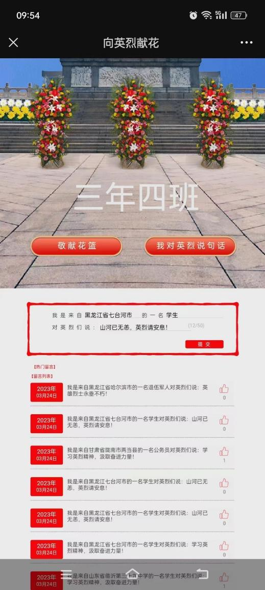 清明节前夕,勃利县中小学校关工委组织青少年学生采取各种形式祭典先烈。县城内中小学校关工委组织学生到烈士陵园祭奠先烈。庄严肃穆的西山烈士陵园安放着在抗日战争和解放战争牺牲的烈士墓碑和纪念塔。学生们将鲜花放到墓碑和纪念塔前,入团入队誓言在苍茫的天空中飘荡。杏树乡中学、倭肯中学关工委、组织学生到烈士墓前举行祭扫烈士墓活动,他们敬献花圈,向烈士献辞,表达哀悼和思念。农村各中小学校关工委更多采取播放校园广播、闭路电视和召开主题班会,通过讲故事、朗诵诗词、播放革命前辈宣传片等各种方式祭奠先烈,让学生们继承先烈遗志,长大成为社会主义可靠接班人。全县更多的中小学校开展网上祭英烈活动。勃利县第四中学关工委组织周密,活动开始时关工委与党团组织共同制定了本次活动方案。从3月25日起学校通过班主任微信群、家长微信群平台,广泛地发动家长与学生积极参与活动,在全校范围内开展了“网上祭英烈”的文明祭祀活动,到目前,学生和家长共有1000多人参加。学生和家长通过登录网站开设的“网上祭英烈”栏目进行网上祭拜,通过“献一束花、抒一句感言”使同学们了解更多为祖国解放战争、人民自由斗争中抛头颅、洒热血的英勇事迹。全县关工组织通过开展清明节祭奠先烈活动,使青少年学生慎终追远,更加珍惜今天幸福生活,树立为实现中华民族伟大复兴的远大志向。他们牢记:今天的幸福生活是无数革命烈士用鲜血和生命换来的,只有努力学习科学文化知识,掌握更多本领,更好建设祖国,才会更好的回馈先烈的遗愿。