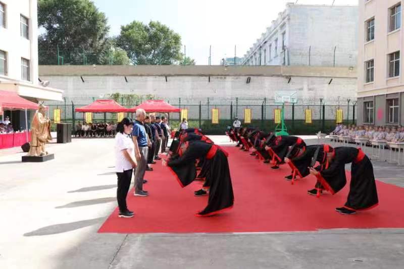 成人仪式上,20名年满18岁的服刑罪犯身着汉服入场,在活动现场厅局关工委领导及现场嘉宾为他们加冠、正冠,勉励他们遵规守纪、认真学习、早获新生。“我会用自己的实际改造回报父母,回报社会,争取早日成为一名遵纪守法的社会公民!”服刑罪犯在成人仪式上向父母郑重许下承诺,并向他们行敬茶礼。