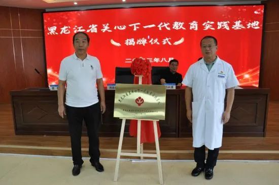 揭牌仪式在激昂的出旗曲中拉开帷幕,黑龙江省眼科医院党委书记刘志峰、黑龙江省直机关关工委副主任雷铜共同为“黑龙江省直关心下一代教育实践基地”揭牌。