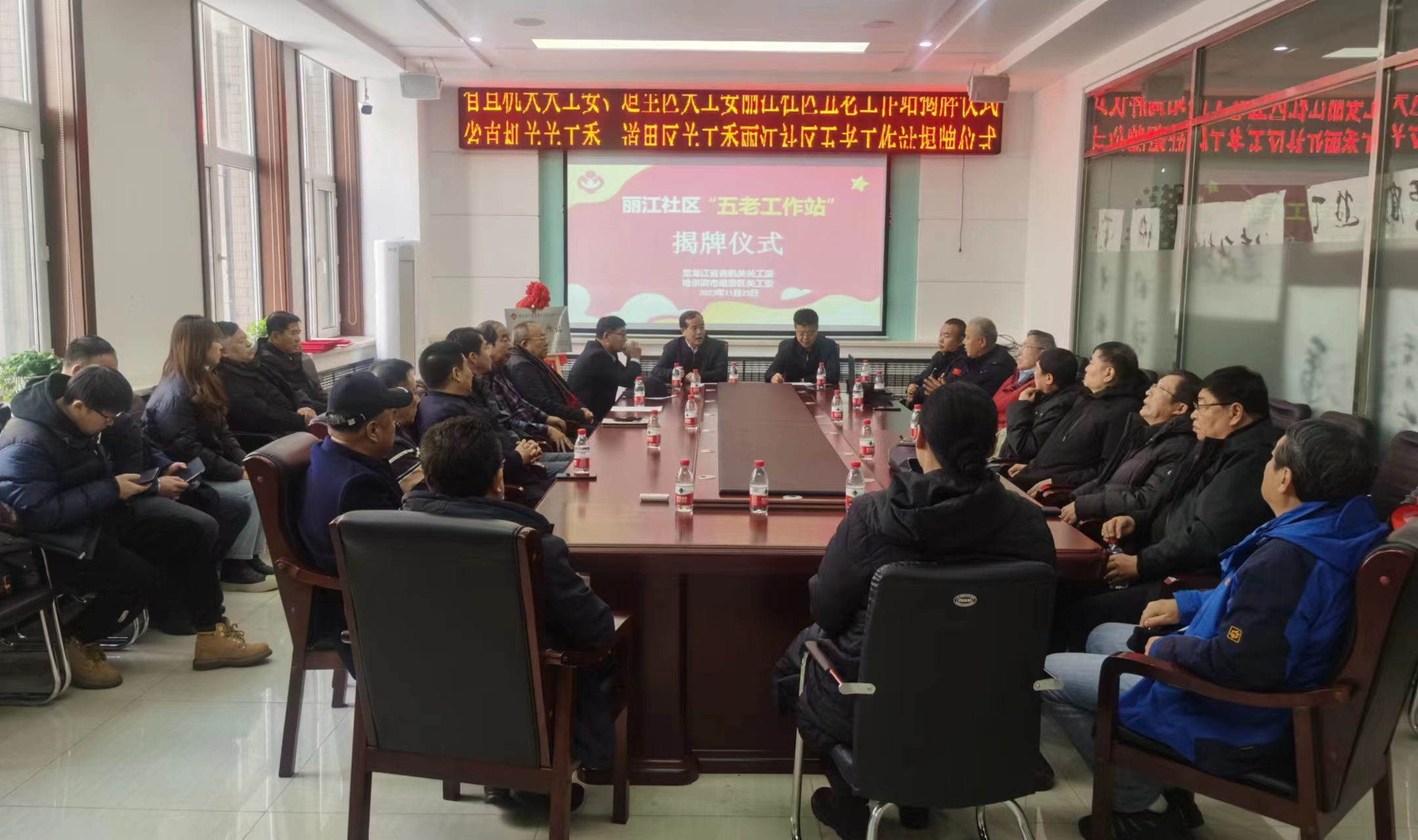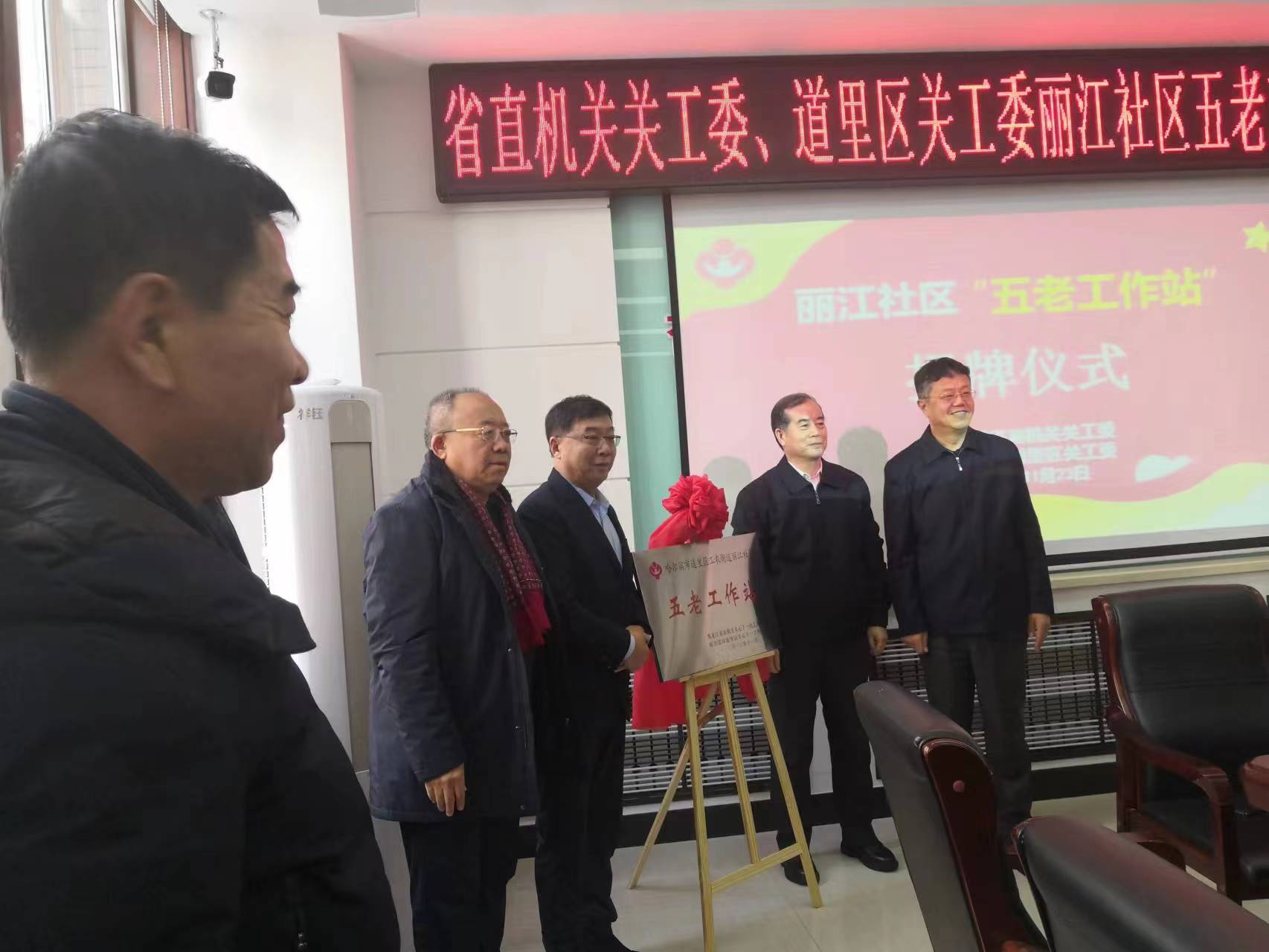 11月23日下午,黑龙江省直机关关工委与哈尔滨市道里区关工委研究商定,在道里区工农街道丽江社区举行了“丽江社区五老工作站”成立揭牌仪式。