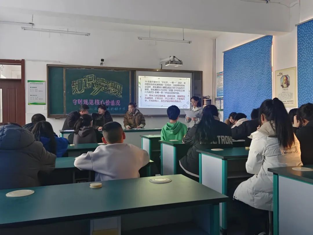 为加强学生行为习惯养成教育,增强学生自律意识,培养学生良好的行为习惯和健康文明的方式,11月20日下午,浓桥镇中学组织开展“中学生守则、日常行为规范、社会主义核心价值观”知识竞赛,本次竞赛由王红云副校长、于刚副校长和王秋玲老师担任评委,辛茹和张秀珍两位老师担任记分员,在吕春红老师的主持下此次活动正式开始。