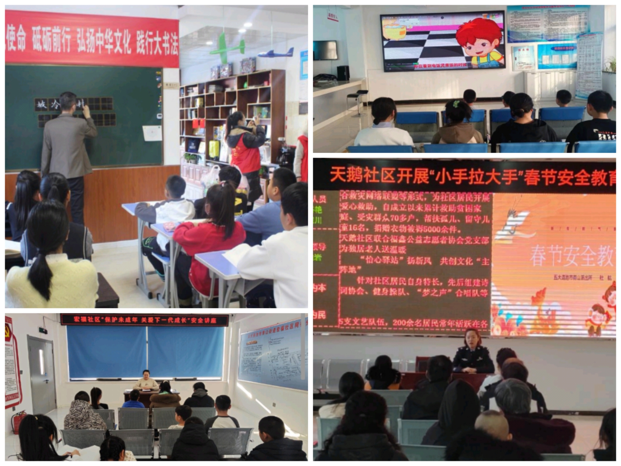 1月18日,天鹅社区关工小组组织开展了“小手拉大手”春节安全教育活动,辖区派出所民警用通俗易懂的语言并结合案例,向小朋友们讲解交通安全、燃放烟花爆竹、防火防灾、防溺水等安全知识,并进行了趣味性互动问答;国土社区关工小组开展了“浓情腊八·温暖‘粥’到”走访慰问活动,其中走访慰问了辖区困境儿童高永财,了解其生活和学习情况,并向他及家人送上节日的腊八粥、水果等慰问品,弘扬了中华民族优秀传统文化,为寒冬里的弱势群体增添了浓浓暖意;建安社区关工小组开展“关心下一代、携手护成长”活动,走访慰问国锋练字学校坚持每天练习书法的中小学生,鼓励他们弘扬中国书法艺术,演绎书法的神气魅力;阳光社区关工小组组织辖区未成年人开展安全知识观影活动,通过播放动画版短片的方式,学会了正确用气、用电等安全知识,提高了未成年人的安全意识;青山街道各社区关工小组通过组织形式多样、内容鲜明、饶有兴趣的系列活动,让广大青少年在弘扬中国优秀传统文化中砥砺品格、增长本领、展现自我、提升自信,度过一个安全、充实、快乐的假期。