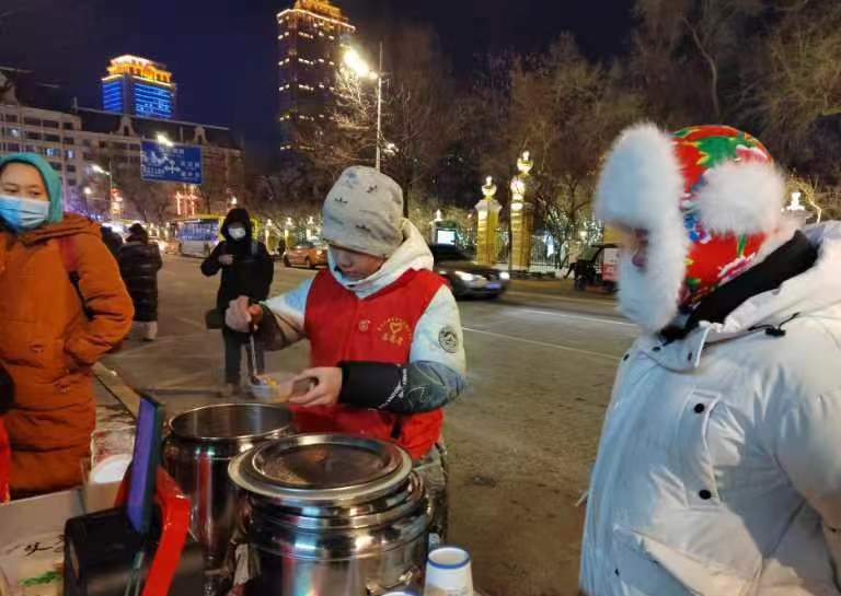 傍晚时分,小志愿者们在尚志大街兆麟公园附近支起了小摊,备好了热饮。尽管寒风凛冽,气温骤降,但这群小志愿者们的热情却如火如荼。当南方游客们经过时,小志愿者们主动上前,微笑着递上红枣姜糖水、大碴粥等暖心饮品。有的游客被这突如其来的关怀感动得热泪盈眶,“欢迎您来到我的家乡哈尔滨!”,孩子们用真挚的话语、热情的服务态度让来往的行人赞不绝口。