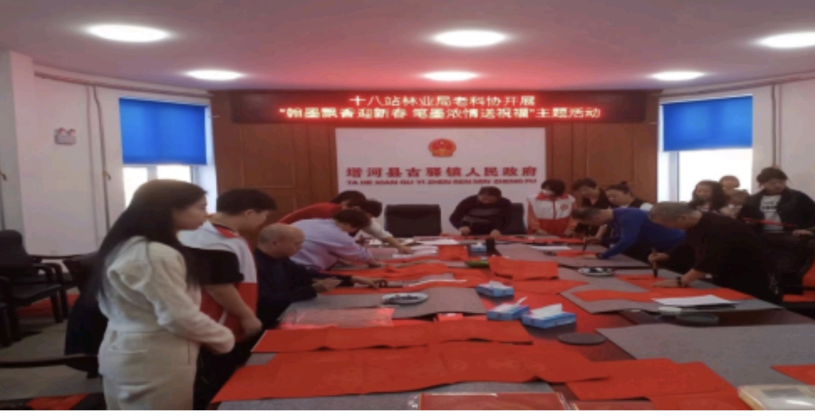 1月30日,在春节来临之际,十八站林业局关工委组织书法协会的7名“五老”书法家开展“翰墨飘香迎新春,笔墨浓情送祝福”主题活动,书法老师在现场开展写对联、迎新春、送祝福活动,在翰墨飘香中给古驿站“五老”及职工群众送去新春的祝福。活动现场热闹非凡,职工群众在领取春联的同时,也领略到了书法的魅力。也吸引了不少“五老”及职工群众前来观看,大家围在自己心仪的“书法家”前排队等候,一边挑选着自己心仪的作品,一边欣赏着书法创作,品评春联寓意。