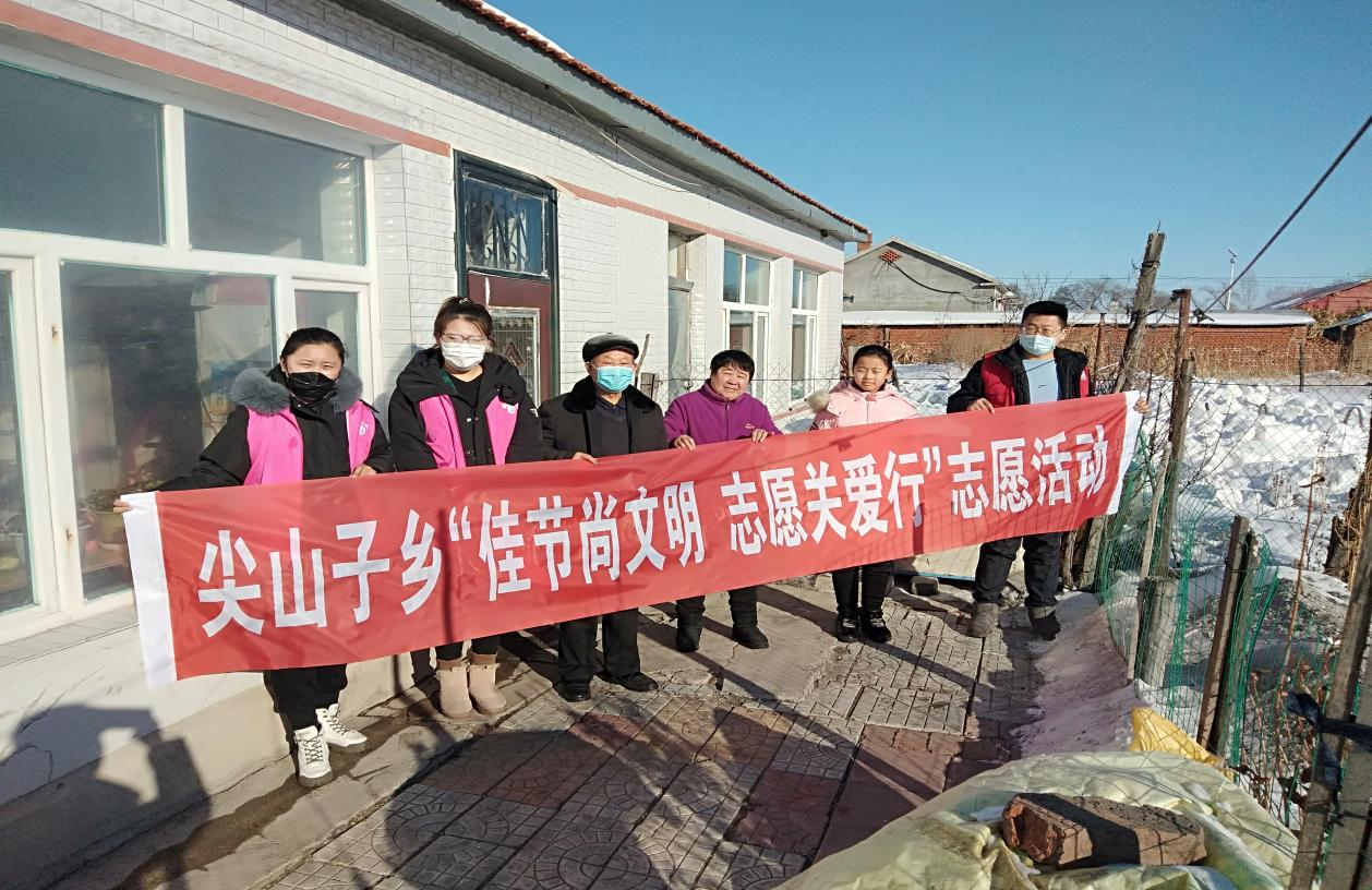 尖山子乡关工委、团委、妇联联合开展"佳节尚文明,志愿关爱行"活动,青年志愿者为孩子送去关怀金、关工委为孩子送去学习用具、巾帼志愿者为脱贫户家庭送春联送祝福。