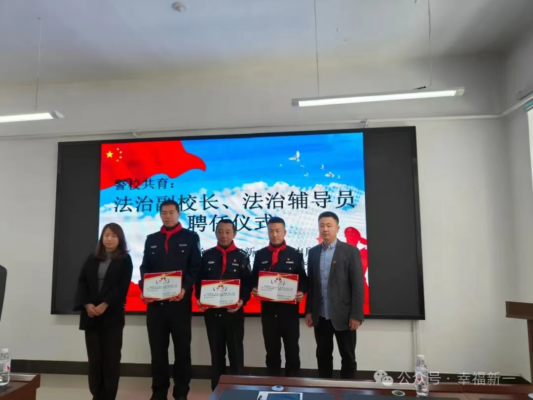 为深入开展青少年法治宣传教育工作,教育引导青少年学法、懂法、守法,营造一个和谐、平安的校园环境, 4月8日道外区新一小学校关工委举行了法治副校长和辅导员聘任仪式。本次活动由德育主任刘学慧老师主持,首先,少先队员代表为新聘任的法治副校长、道外公安分局新一派出所副所长李天成,法治辅导员孙景章、张书毓三位警官佩戴红领巾,并且献上了少先队员最崇高的敬礼,学校领导为三位警官颁发了聘书。