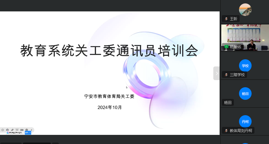2024年10月11日,宁安市教体局关工委组织召开教育系统关工委通讯员线上培训会议,全市各乡镇中心校、市直中小学、幼儿园通讯员通过线上参会,教体局关工委办公室主任刘丹柯就2024年关工委主要工作内容、组织机构、通讯员职责等方面作具体说明并提出相关要求,教体局关工委通讯员杨瑷铭对信息报送流程和投稿注意事项进行详细讲解。