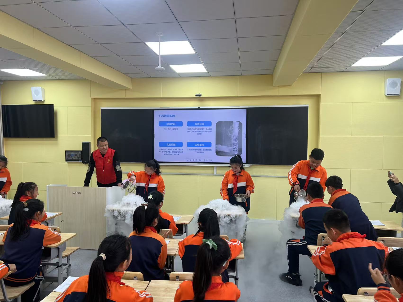 随后,老师通过“干冰与水”、“干冰与火”、“干冰与洗手液”三个互动小实验让孩子们更直观深刻的了解了干冰的一些特性和用途。实验过程中,学生们争先恐后的和老师互动,在亲身体验中学习科学知识,感受科技魅力。