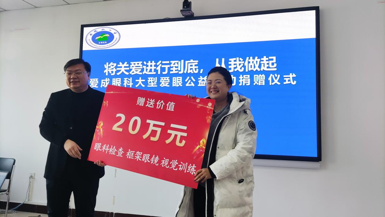 市爱成眼科门诊主任徐亚意代表捐献方致辞中说,双鸭山爱成眼科门诊开展此次爱眼捐赠活动,为双鸭山市第一中学有近视的学生捐赠总价值20万元的爱心基金,其中包括全套专业眼科检查、整套框架眼镜共660付,斜弱视视觉训练2000次。希望借助此次捐助活动向社会传递正能量,让更多已经有近视的青少年得到及时的矫正。希望学生们以优异的成绩回报社会,服务人民,建设双鸭山。