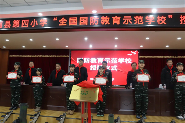 授牌仪式上,张云升在致辞中对第四小学长期以来致力于深耕国防教育,以“军事素养体验营”为载体,着力还原真实军旅生活,激发学生了解国防、立志献身国防的积极性和主动性,并惠及全县义务教育学校莘莘学子的举措给予充分肯定。他指出,国防教育是一项长期而艰巨的任务,获得“全国国防教育示范学校”的称号,只是一个新的起点,要以此为契机,不断总结经验,开拓创新,进一步提高国防教育工作的质量和水平。黄河与第四小学校长门忠宝共同为第四小学少年军校“全国国防教育示范学校”揭牌,参会领导为优秀学员代表颁发荣誉证书并佩戴“全国国防教育示范学校”徽章。